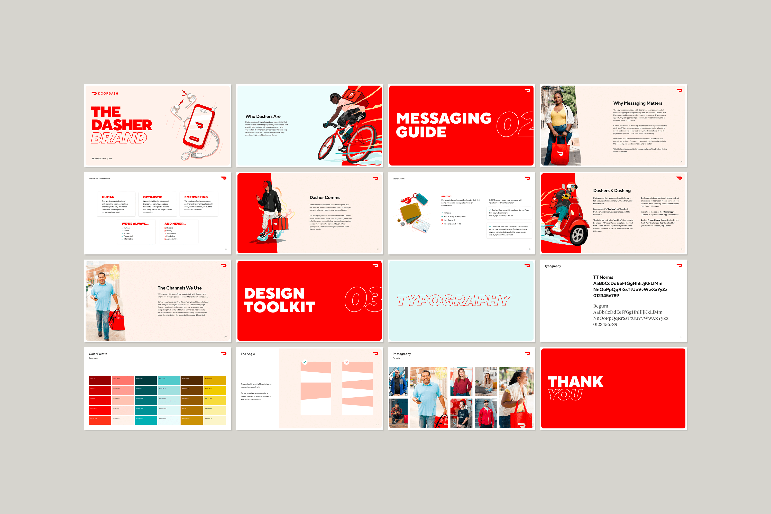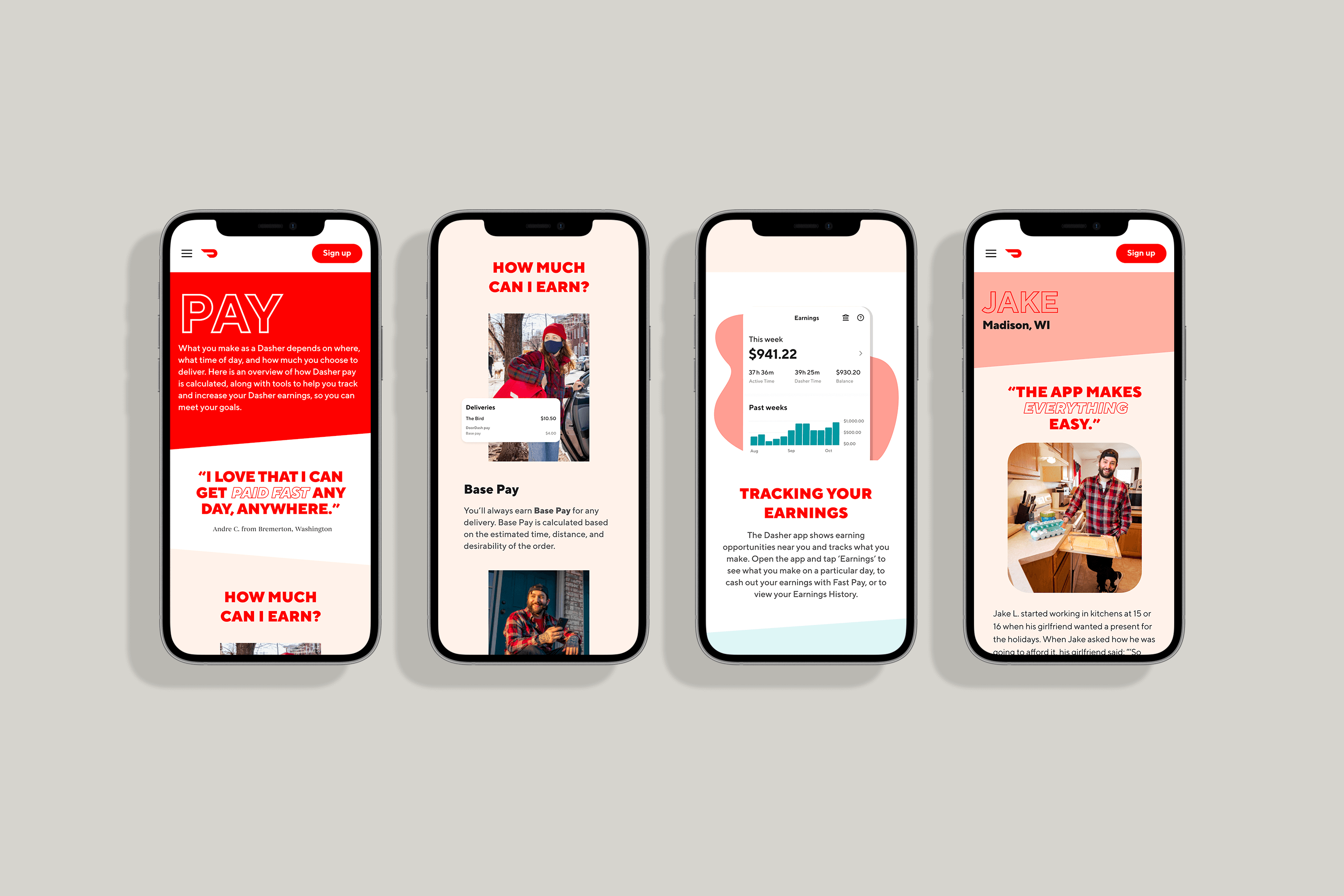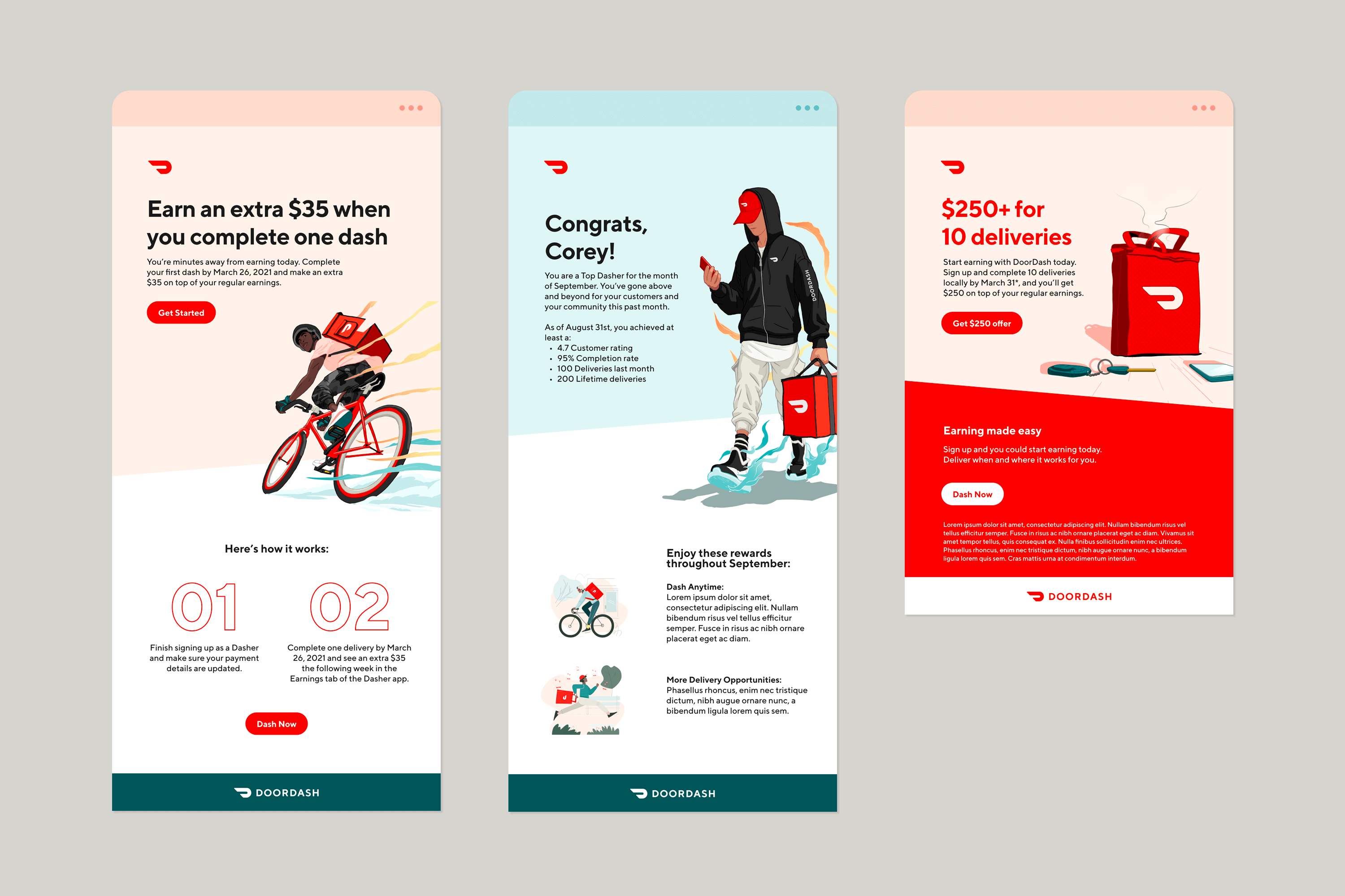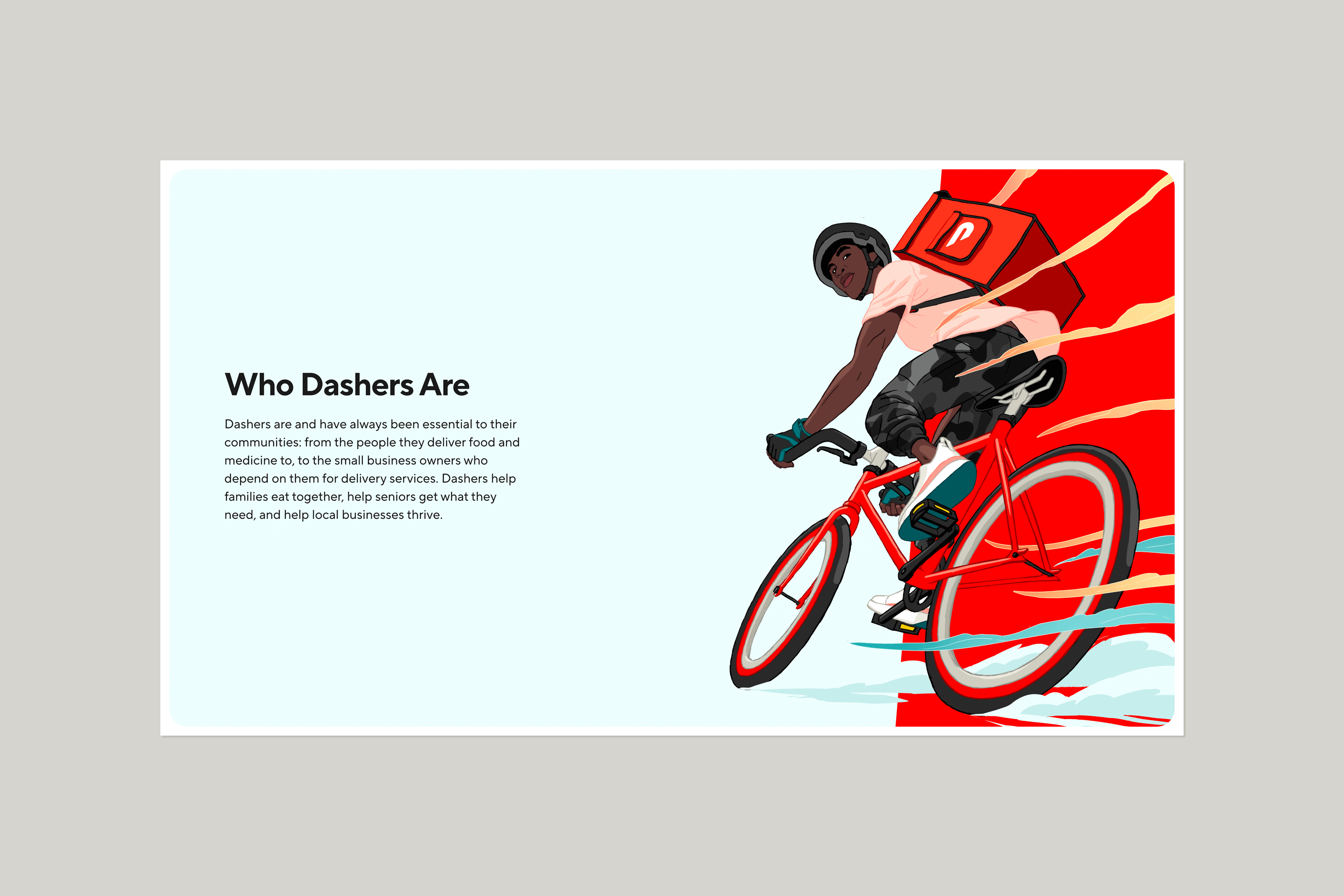 While working with the internal design team at DoorDash, we defined a new visual language for Dasher-related communications that was related to the main DoorDash visual identity, yet distinct enough to stand on its own. The system highlights the dynamic motion of Dashers from a wide range of backgrounds in a natural and authentic way.