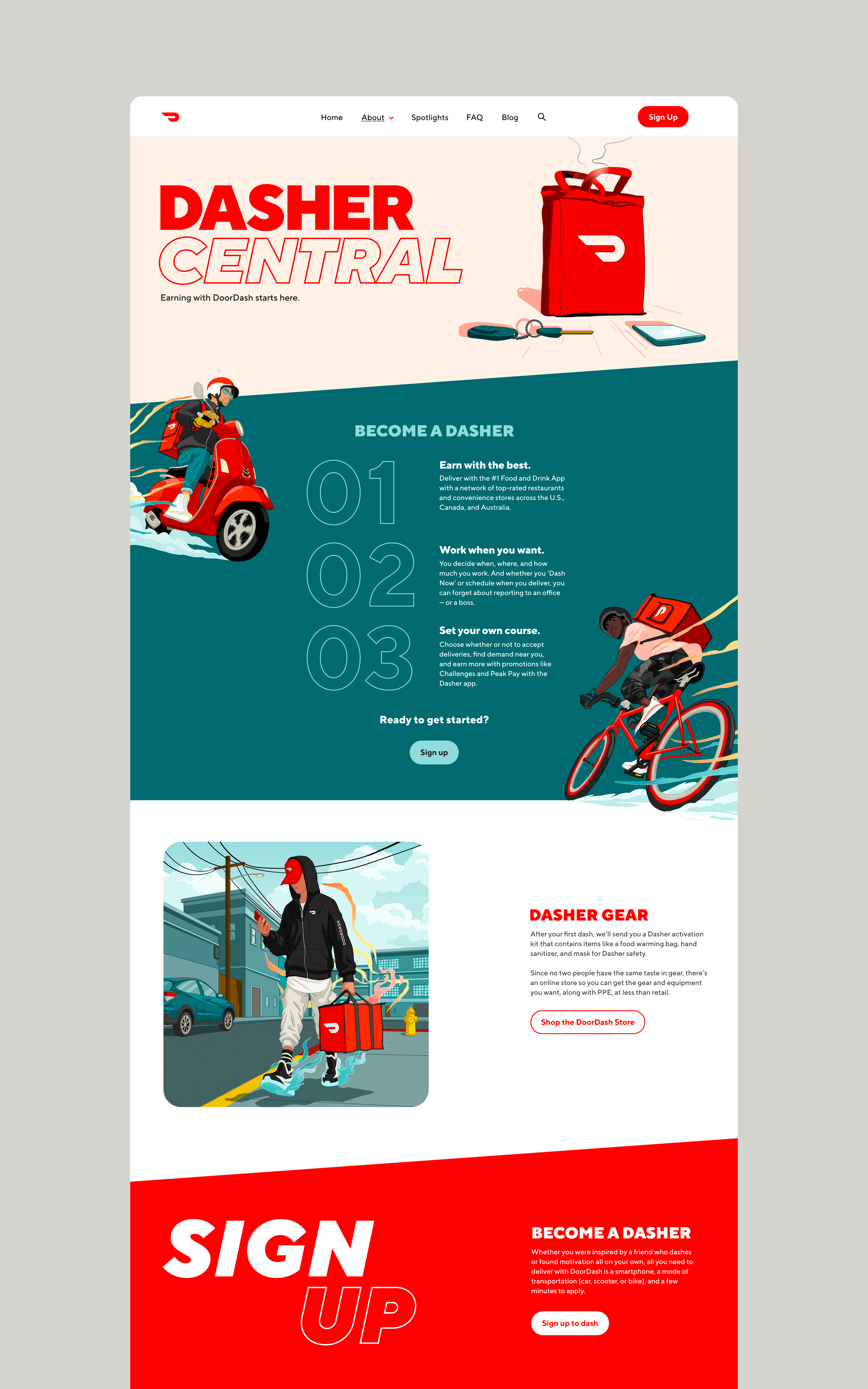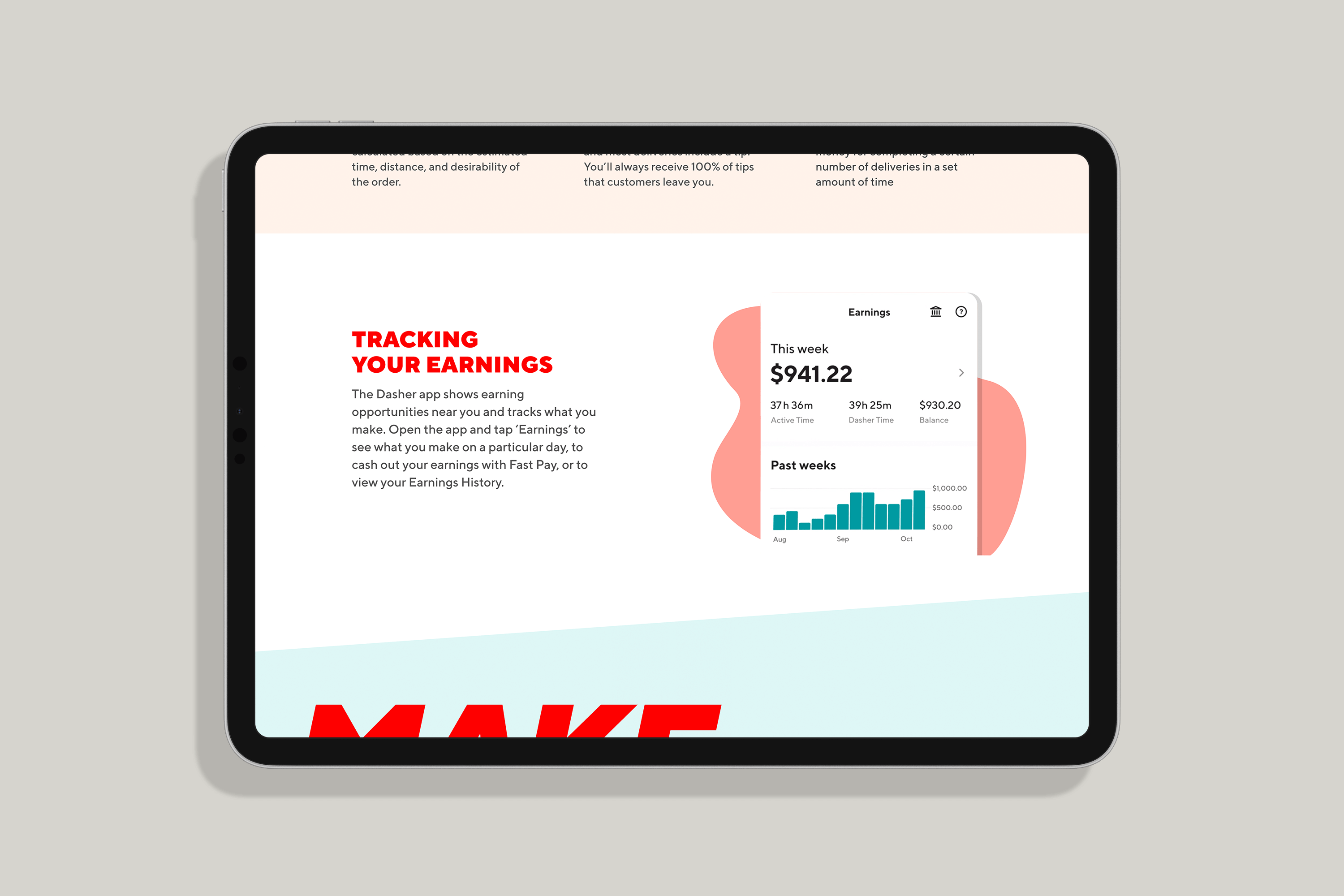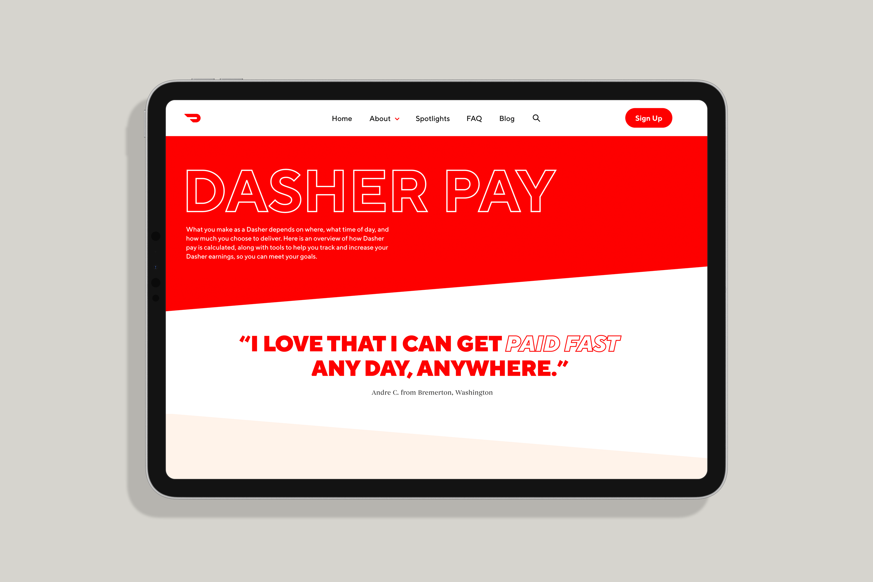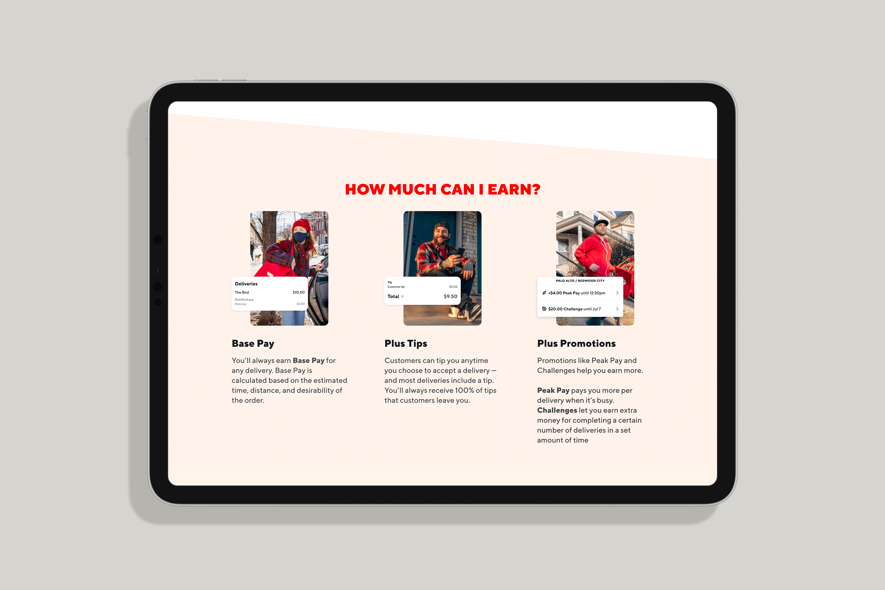 While working with the internal design team at DoorDash, we defined a new visual language for Dasher-related communications that was related to the main DoorDash visual identity, yet distinct enough to stand on its own. The system highlights the dynamic motion of Dashers from a wide range of backgrounds in a natural and authentic way.