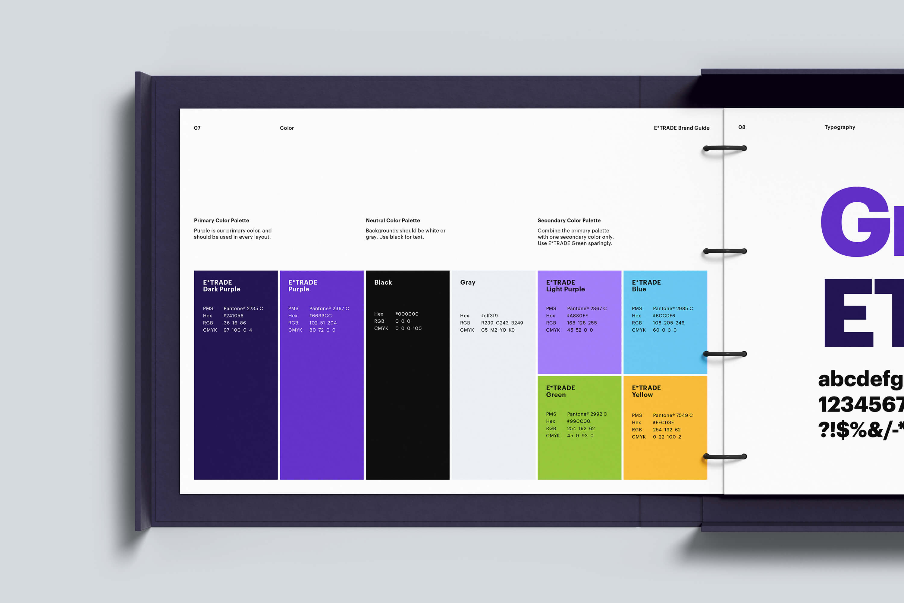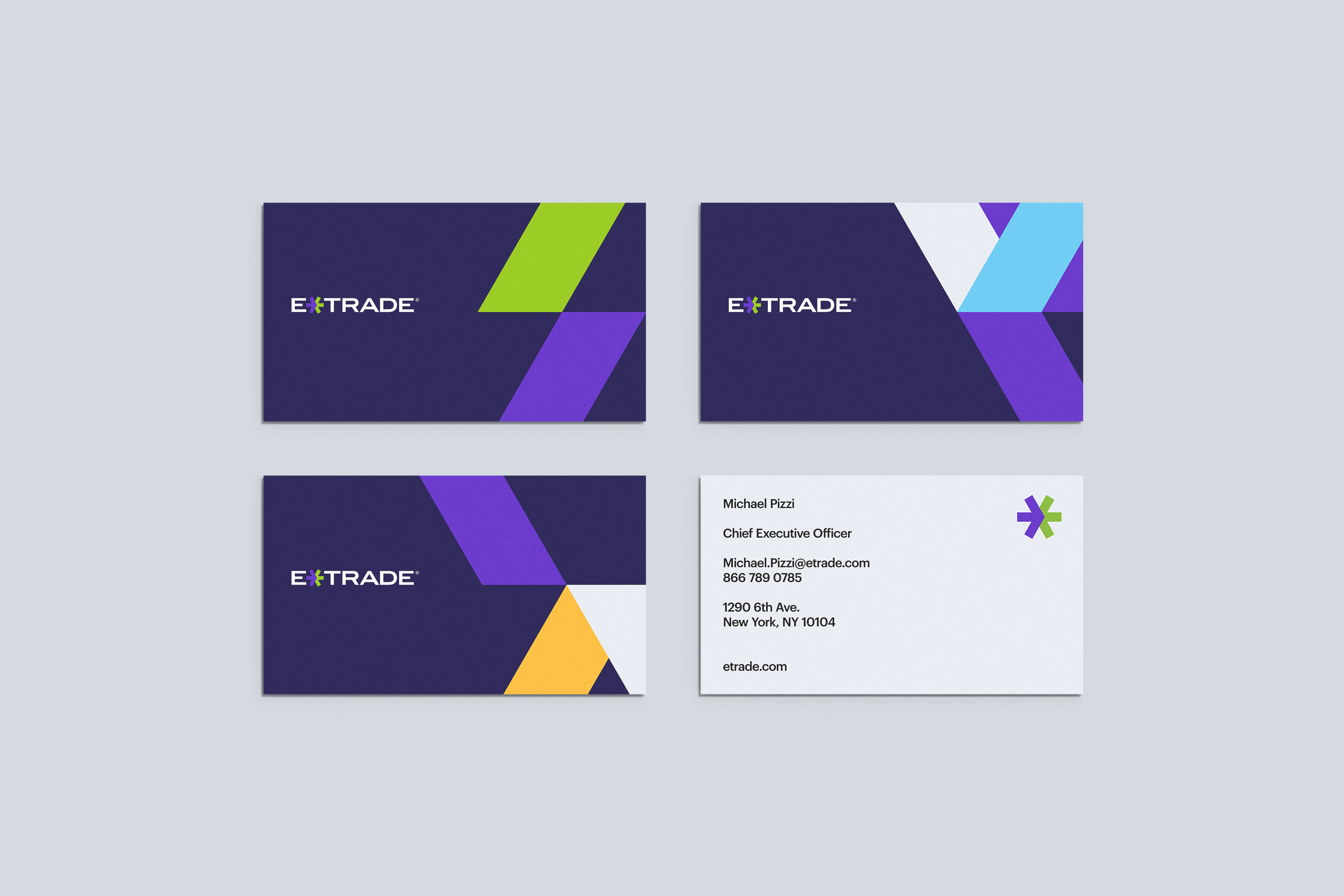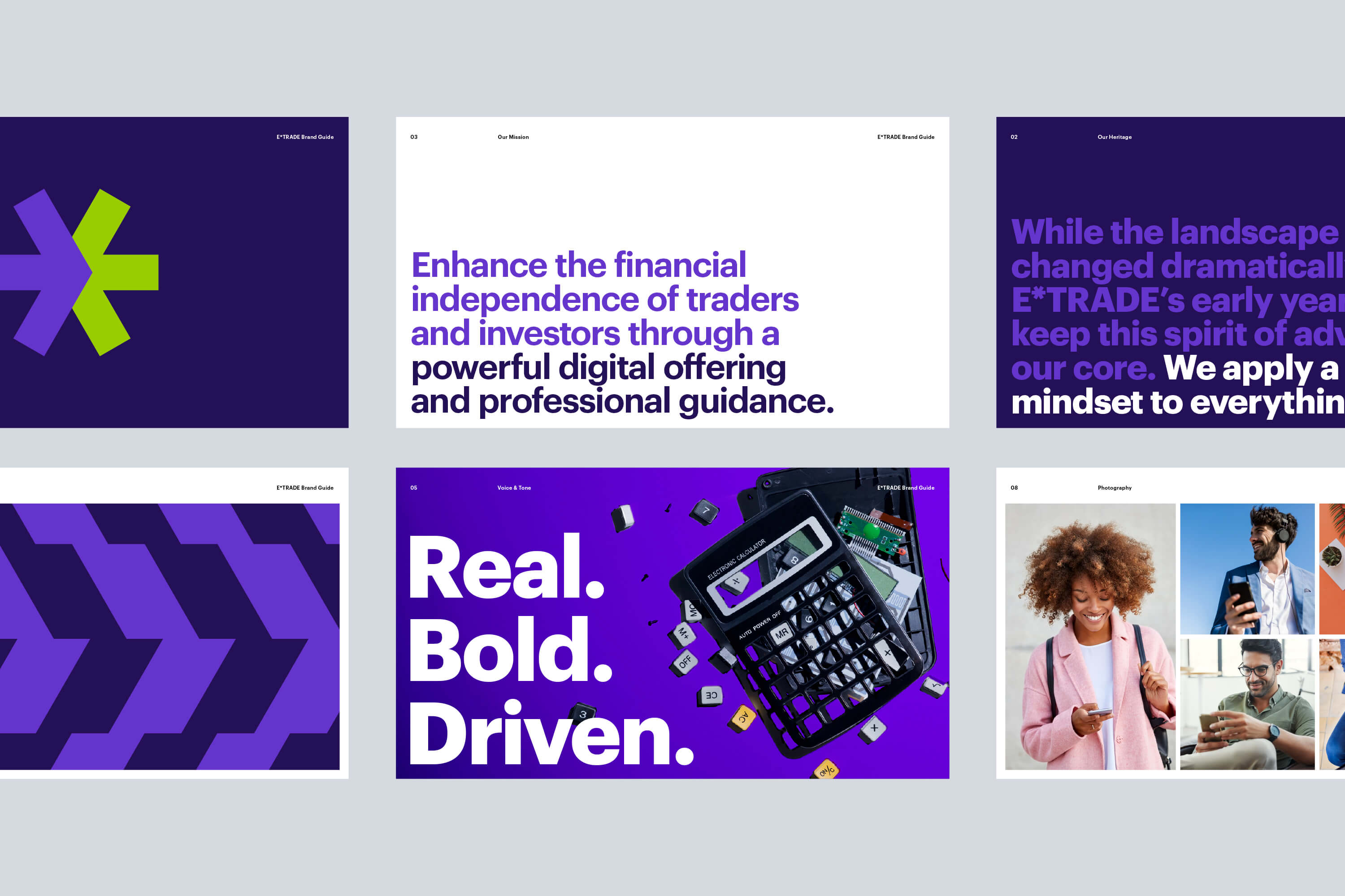 Refresh the E*TRADE design system by rediscovering what made the brand so iconic. Taking advantage of the new typeface and color palette provided by the internal E*TRADE design team, we created a new system that put all the pieces together, which amplified the geometry of the original logo.